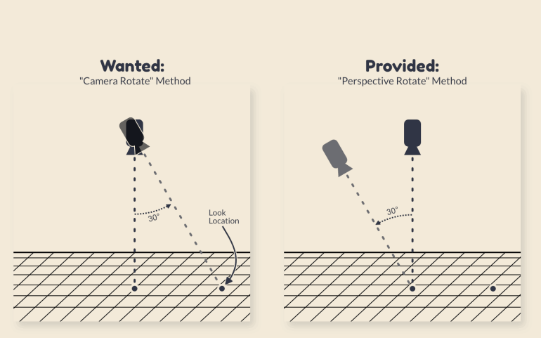 For the app, I wanted a "point of view" angle, where the camera would be centered at the latitude and longitude and altitude of the actual flight. Unfortunately, web mapping libraries take a different approach. They instead take a fixed location on the ground, and move the camera to an angle around it.